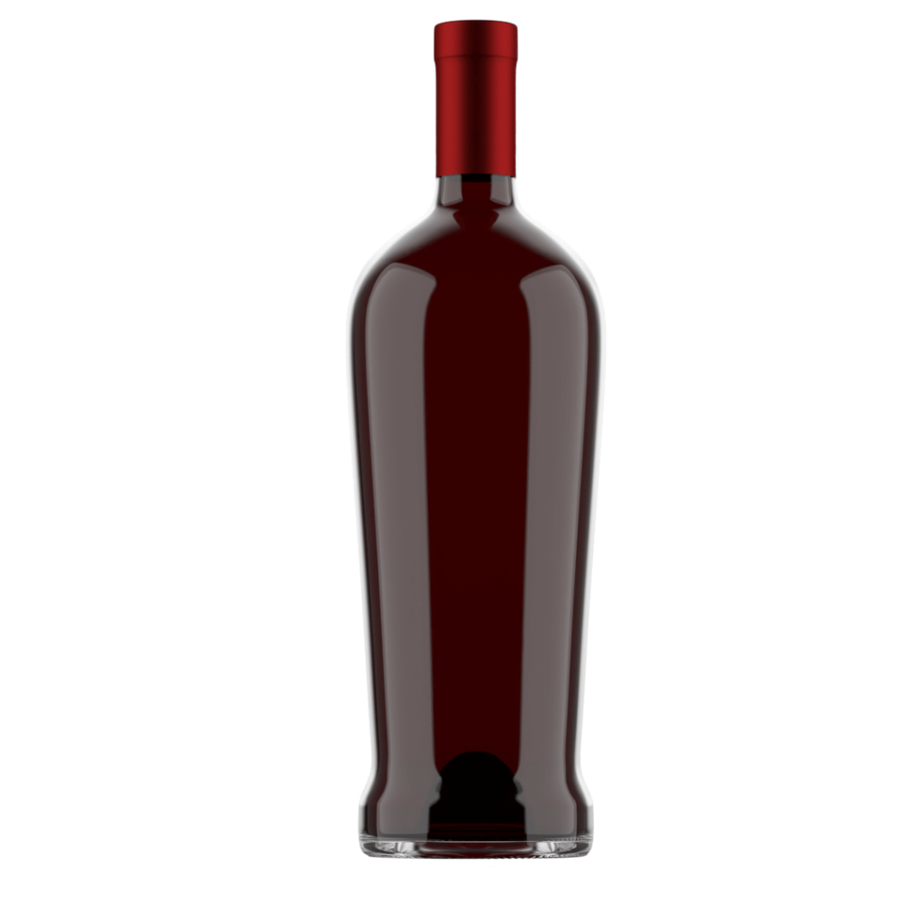 Large, wide body, Cabernet wine bottle, red metallic shrink, with cork, clear glass bottle.