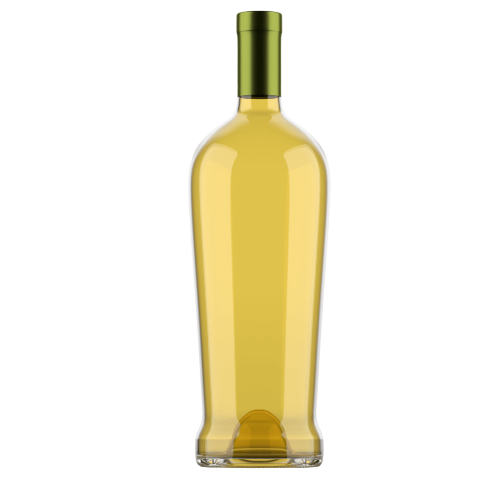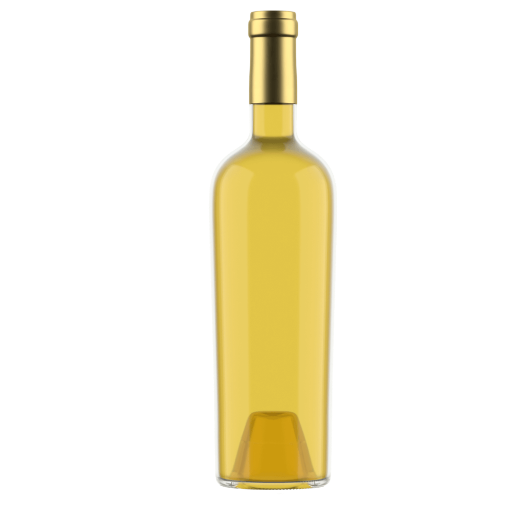 Tall, slim, Chardonnay wine bottle, gold metallic shrink, with cork, clear glass bottle.