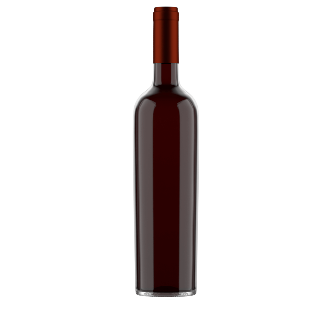 Tall, slim, Cabernet wine bottle, red metallic shrink, with cork, clear glass bottle.
