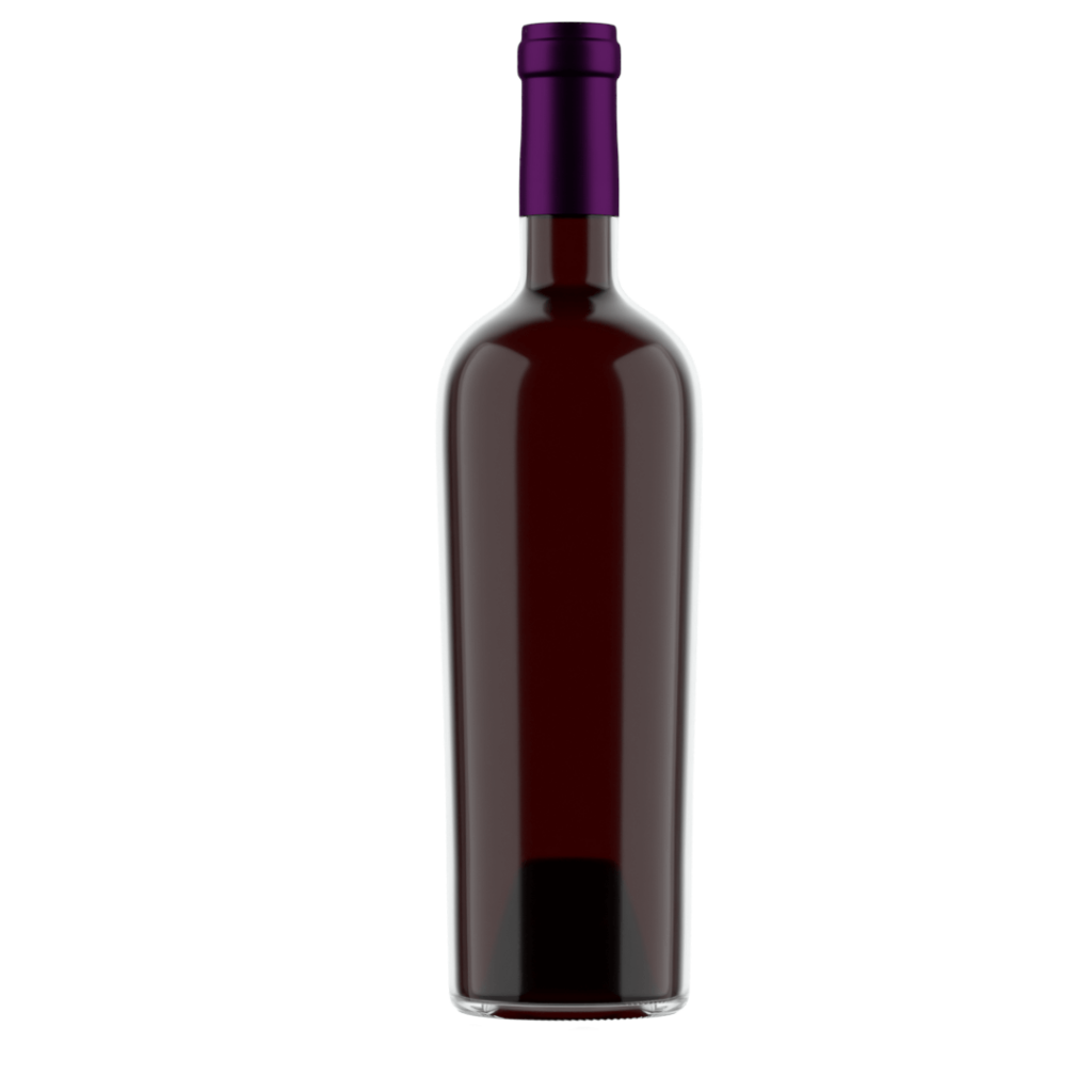 Tall, tapered, Shiraz wine bottle, purple metallic shrink, with cork, clear glass bottle.