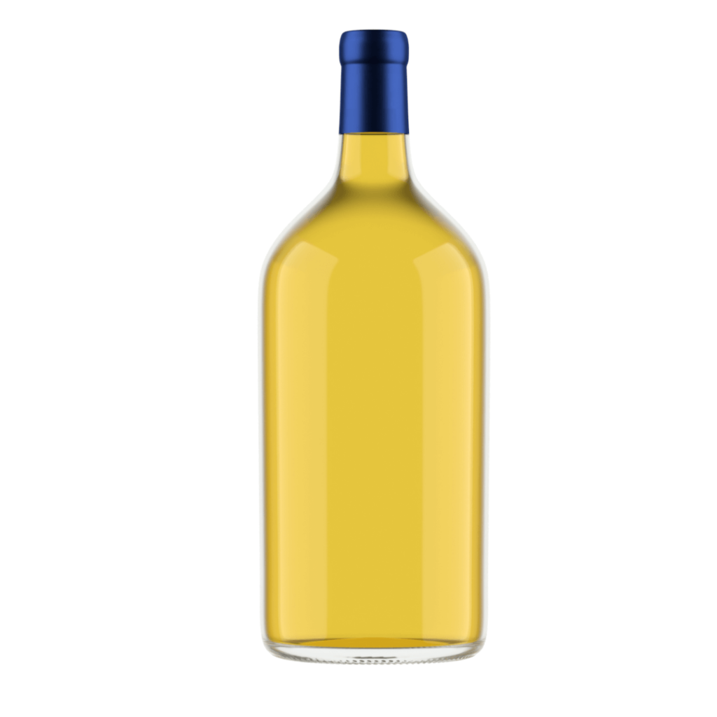 Large, wide body, Chardonnay wine bottle, blue metallic shrink, with cork, clear glass bottle.
